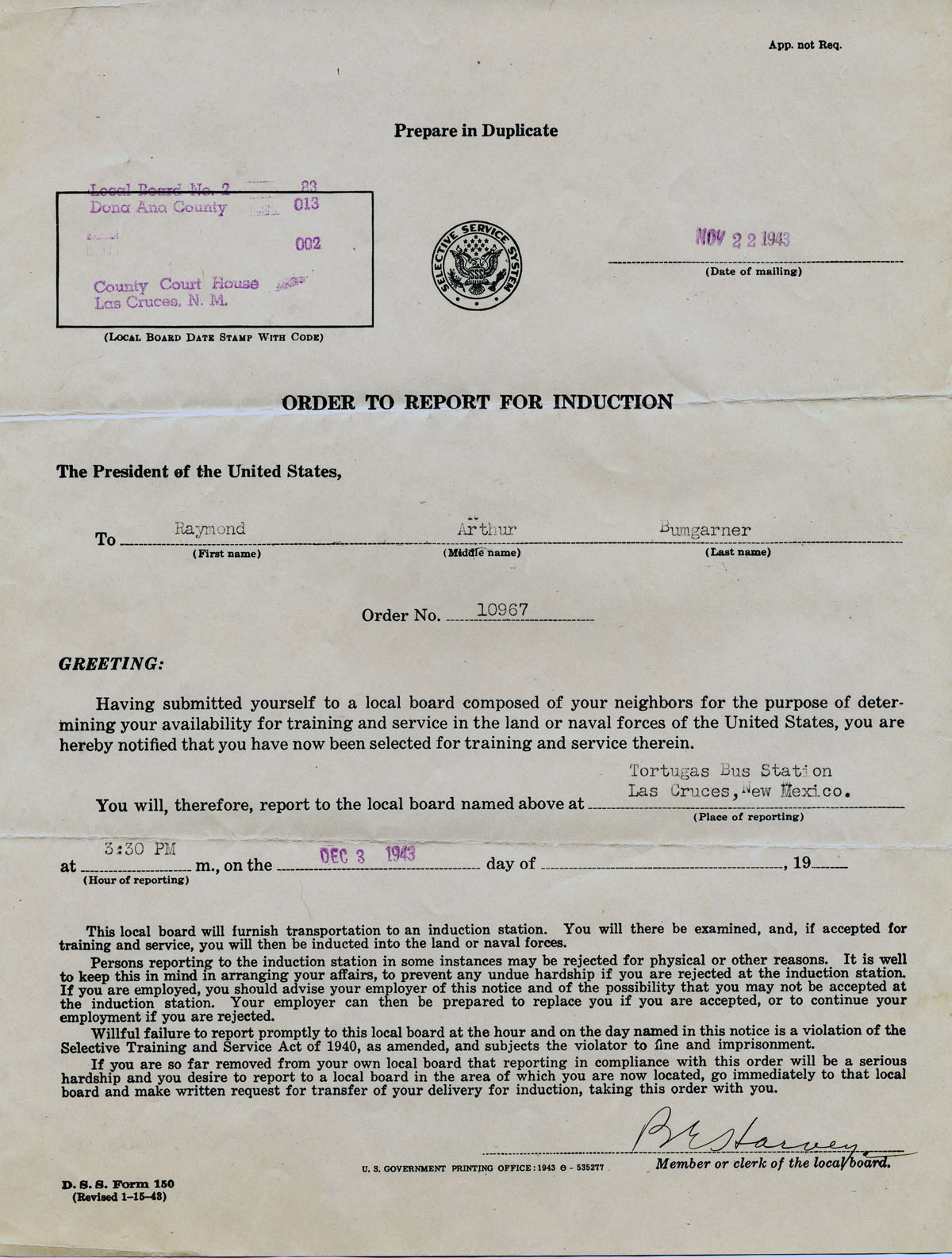 | Dec 3, 1943 | Raymond's -> Order to Report for Induction |