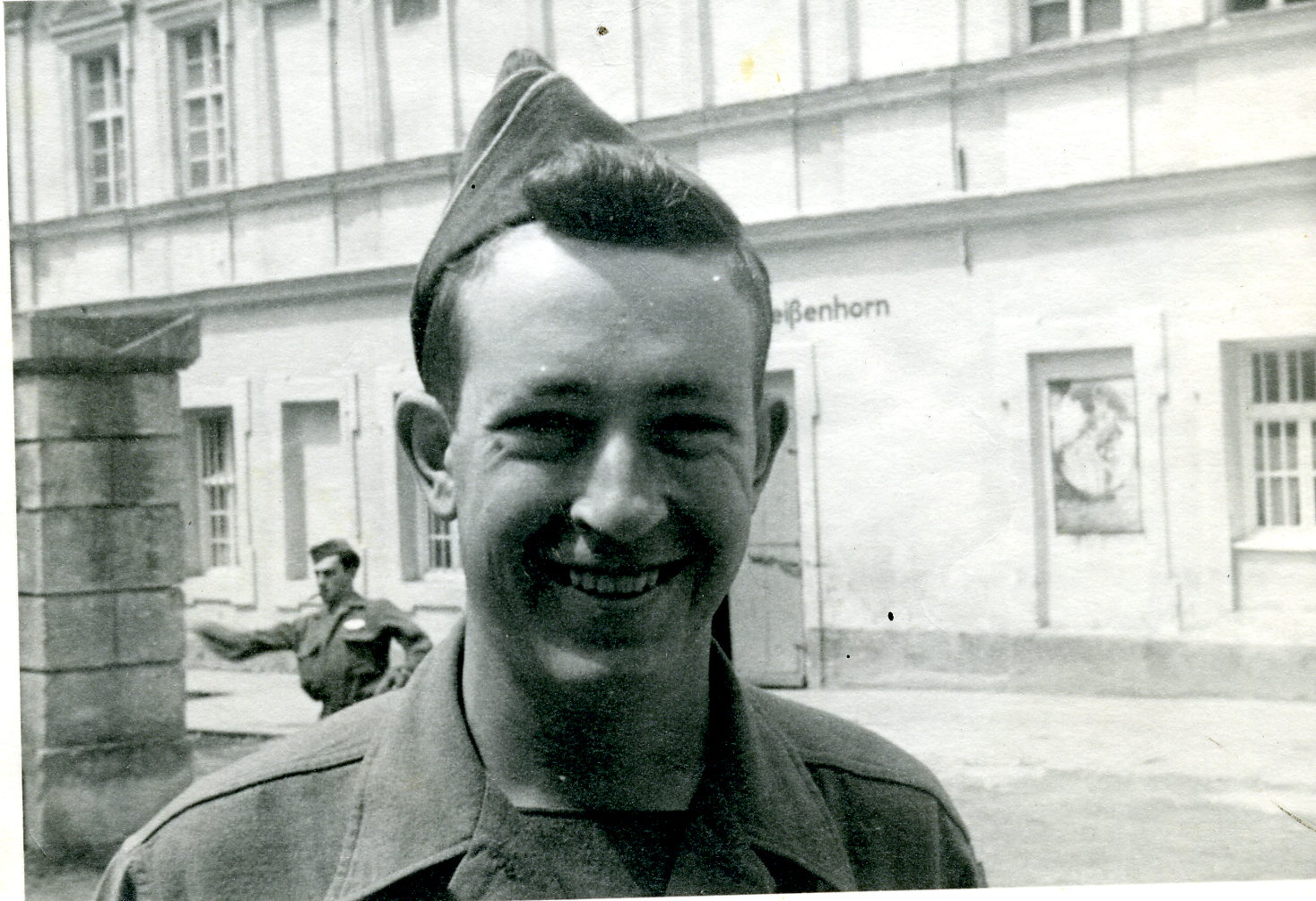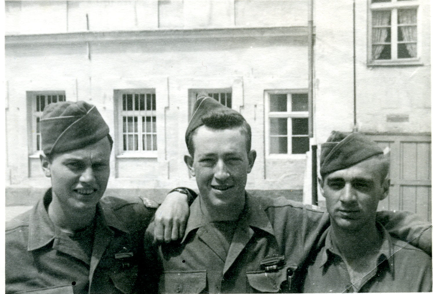 Boy, what a sultry day! Just got in from a formal parade in Stuttgart, where we had to stand for an hour in the hot sun with "ski" jackets, O.D.'s, & neckties, to see some French general get the Bronze Star. Then we had to parade around the square for them. Brother, we nearly melted! They always pick our battalion, out of nine others, to represent the division, because we're the BEST at it. Phooey! I'm sittin' here in my undershirt right now and I'm STILL sweatin'!