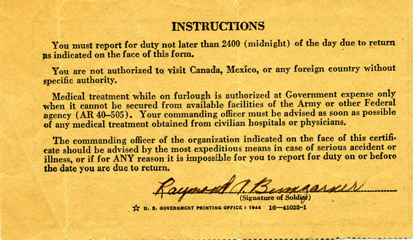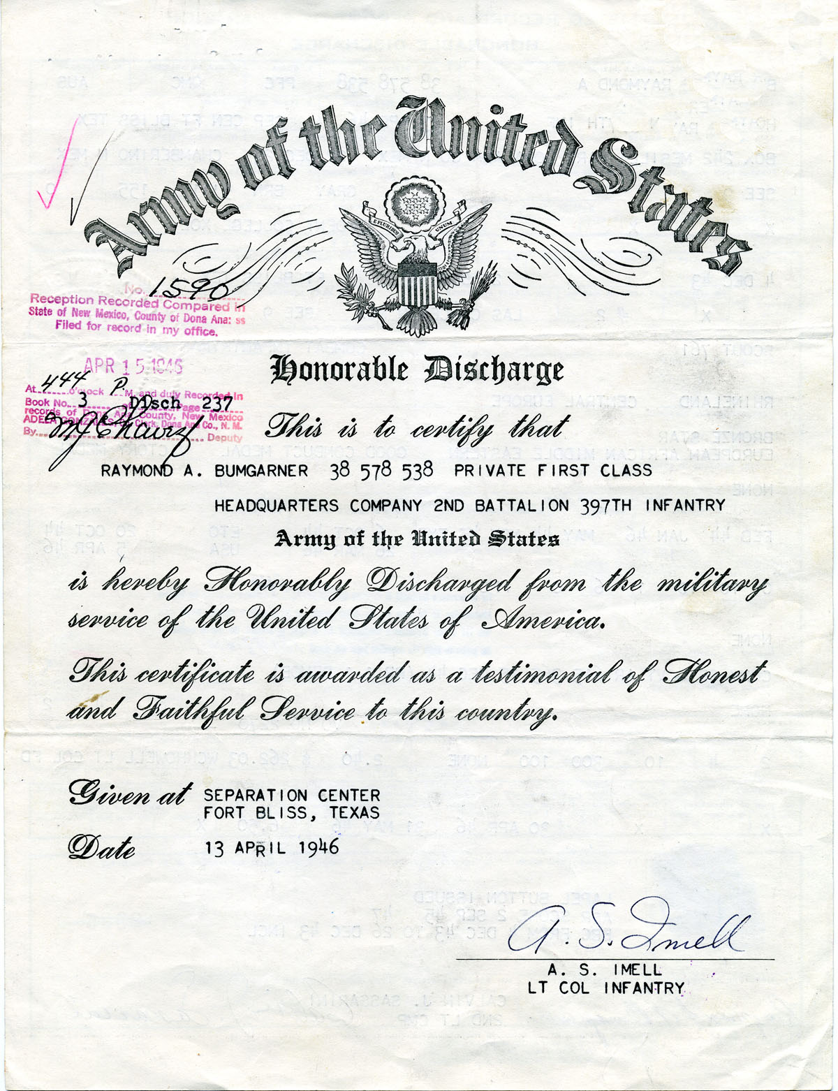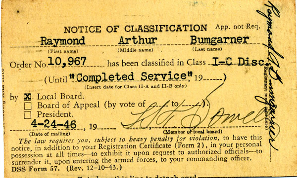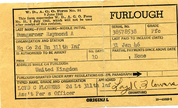 Raymond A. Bumgarner - Military Memories - WWII Page 5 of 5; This Page -> 1946 Pfc. Raymond A. Bumgarner SN 38 578 538 HQ Co, 2nd BN, 397th Infantry, 100th Division [1940-Sep 21, 1944 (in U.S.) ] [Sep 28 1944-Dec 1944] [1st Half 1945] [2nd Half 1945] [1946]